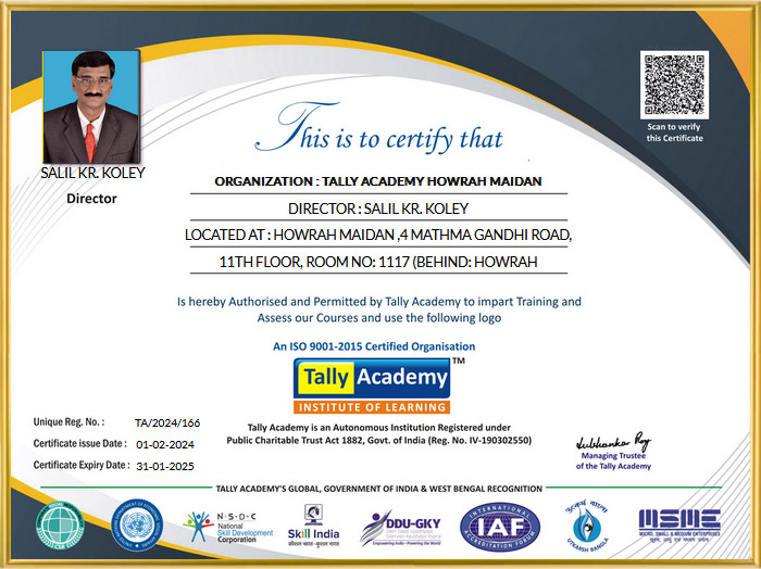 Established in 2005, Tally Academy, India’s one of the most Reputed & Renowned Skill and Talent Development Brand, Tally Academy is an Autonomous Institution Registered Under Public Charitable Trust Act 1882,Govt. of India ( Reg. No. IV-190302550) is also Society Registered (Reg. No. S/2L/47695) W. B. Act XXVI of 1961 .